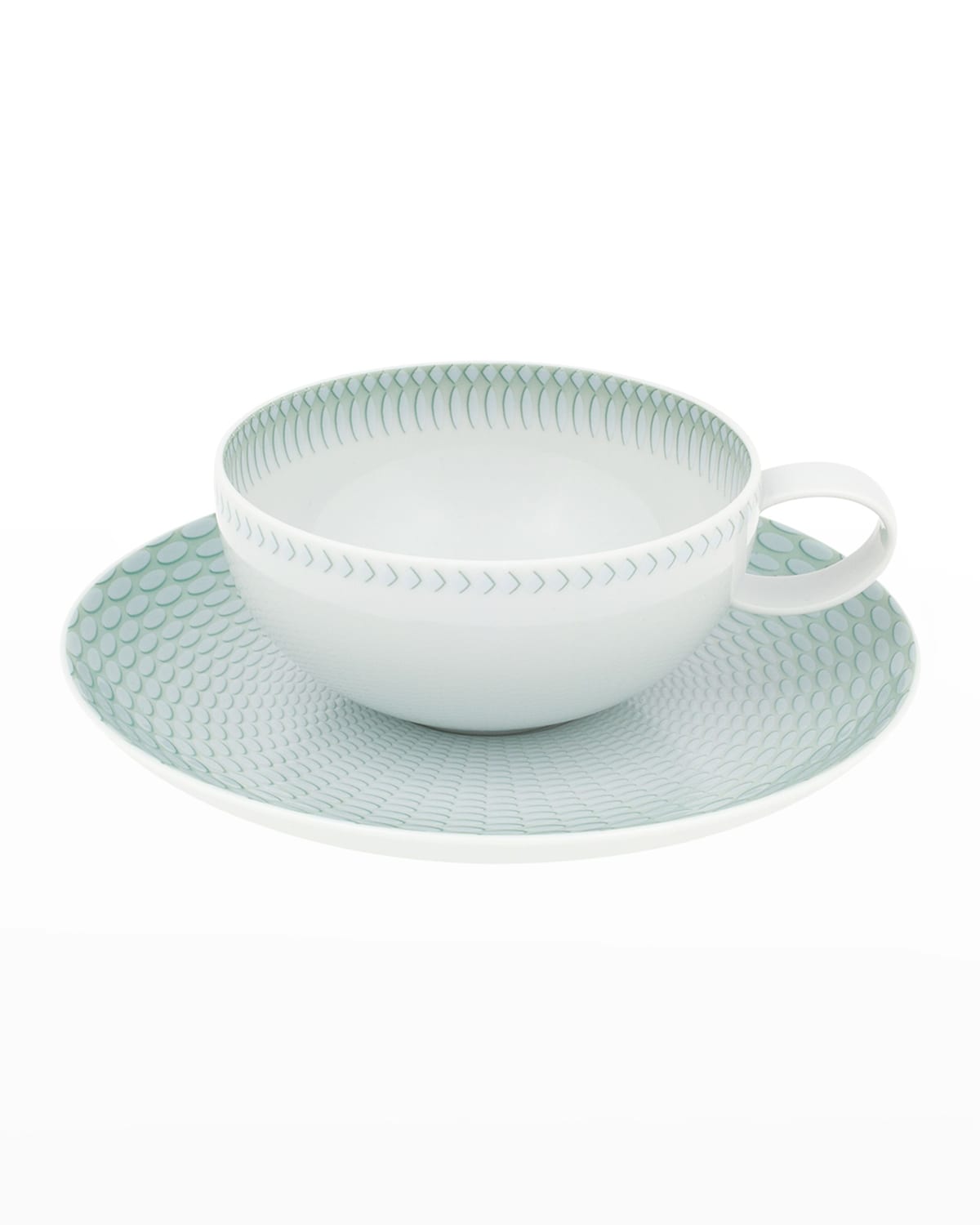 Set of four teacups and matching saucers. Made of porcelain. Each holds 8.5 ounces. Approx. 6.6"Dia. x 2"T. Microwave and dishwasher safe. Made in Portugal.