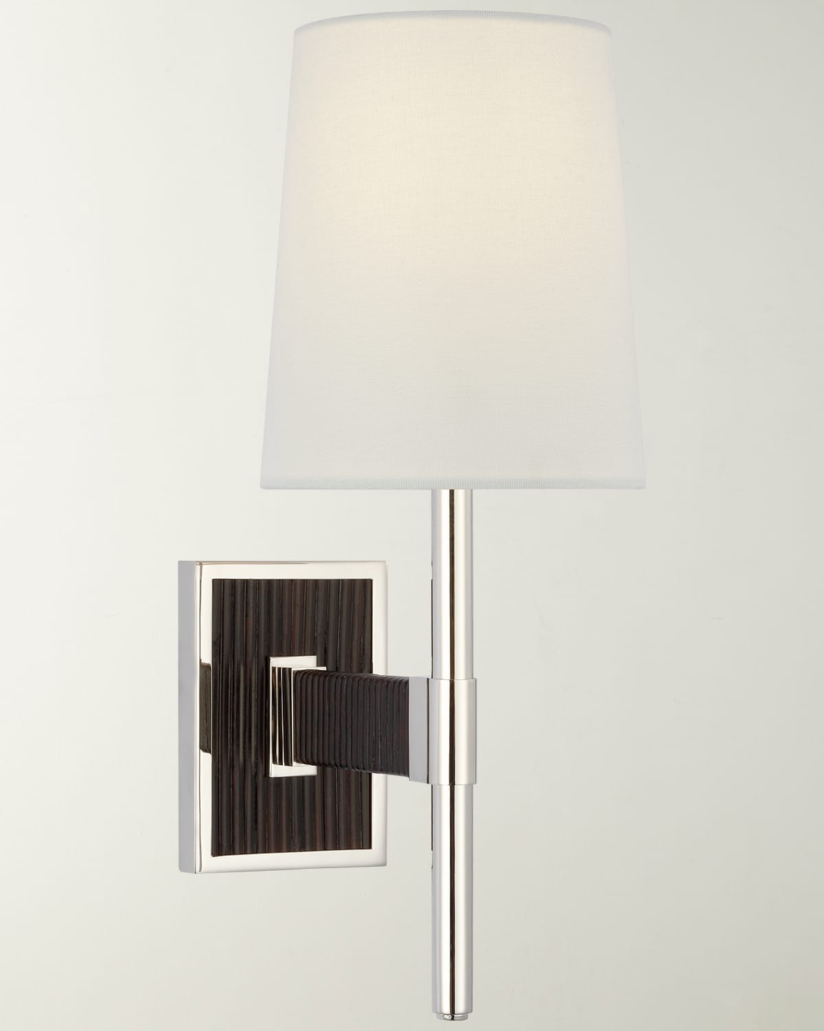 Elle Small Single Sconce In Polished Nickel And Black Rattan With Linen Shade By Suzanne Kasler