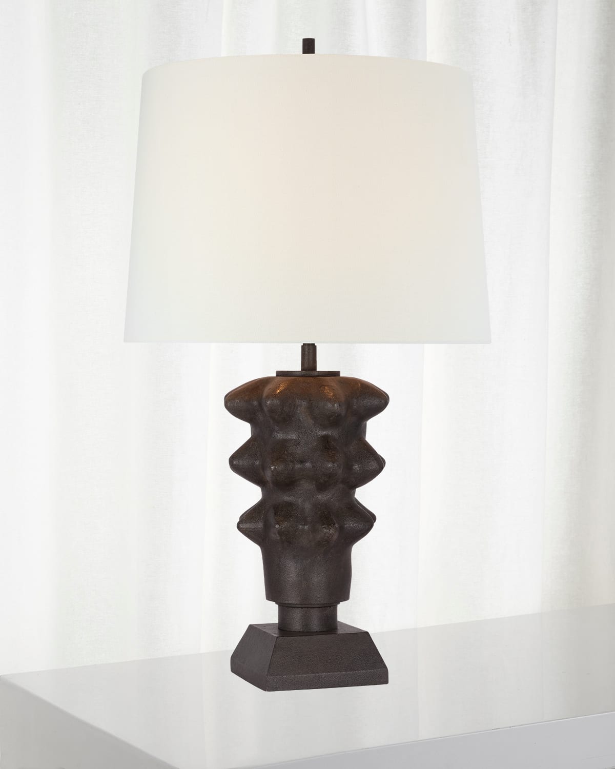 Dimmable lamp crafted of alabaster and linen Alabaster is a natural stone; variations in color and texture are expected Uses one type E 15watt bulb Approx. 14.5"Dia x 25.3"T Lampshade Dimensions: 13"W x 14.5"D x 10.5"T Cord length: 10 ft. UL listed Sold individually Wipe clean Imported Weight, 14.0 lbs Boxed weight, approximately 22.0 lbs