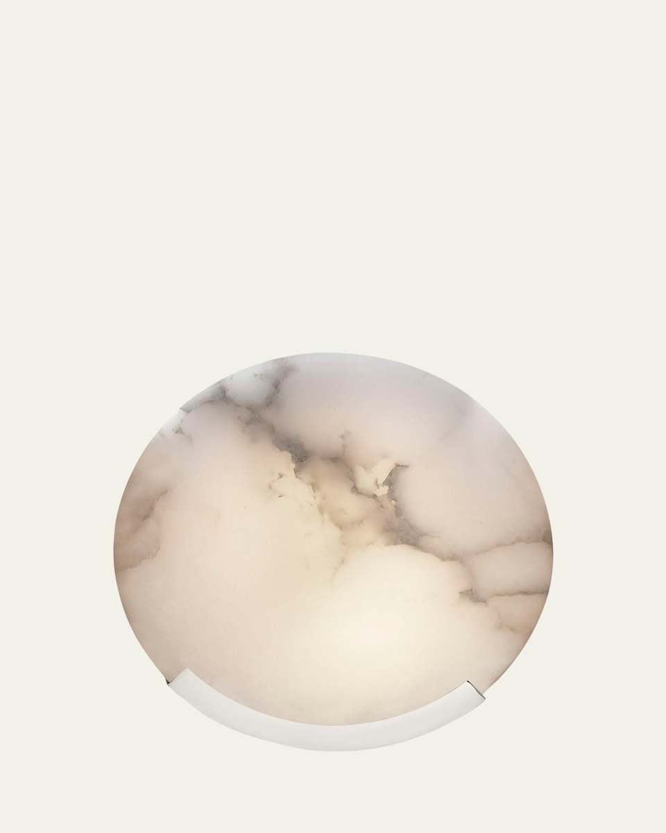 Sconce with rounded alabaster shade. Discreet metal arch. UL listed damp. Uses one 6watt candelabra LED bulb (included). Overall: 7"Dia. x 3.5"D. Back plate: 4" round. Imported. Boxed weight, approximately 5 lbs.