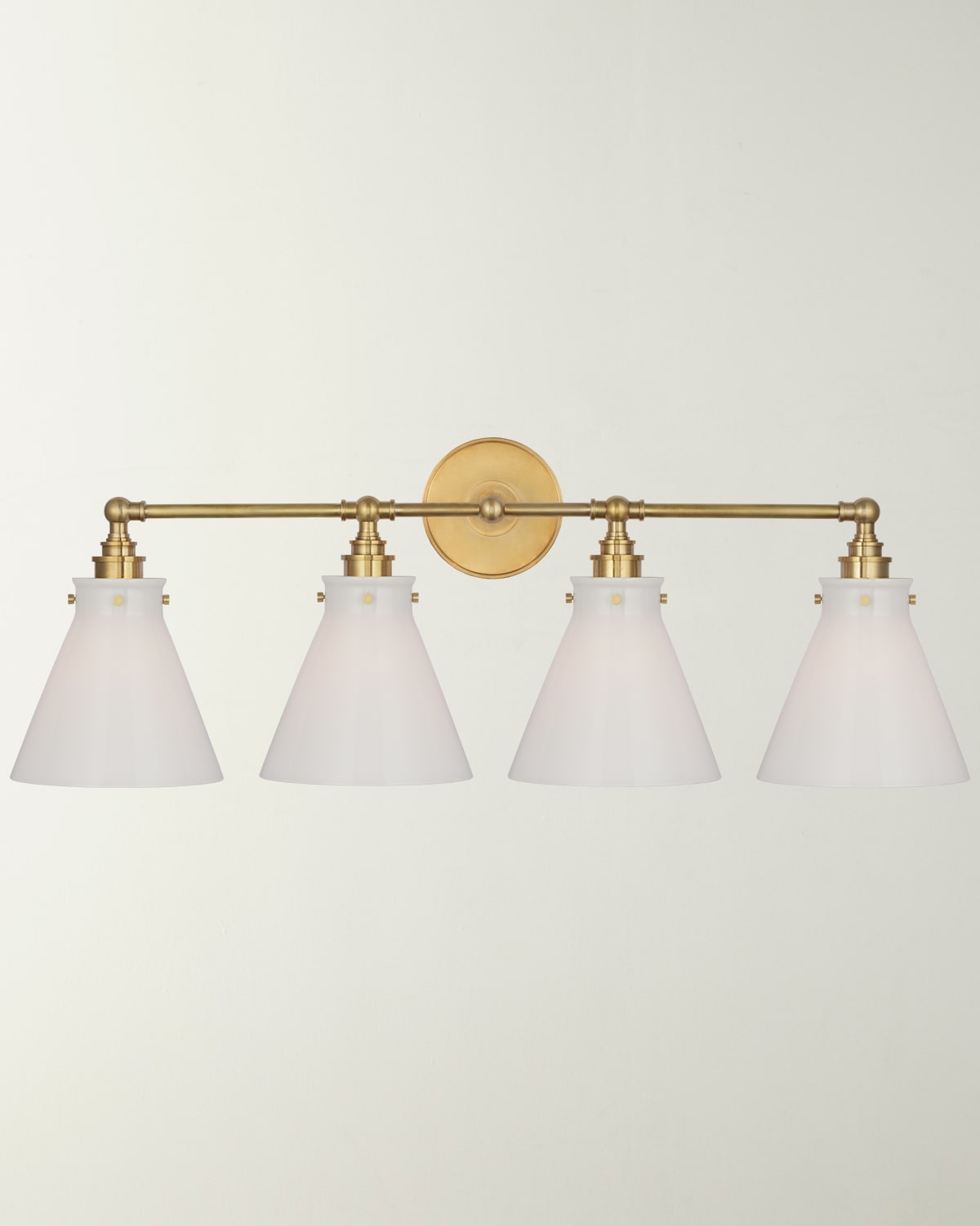 Handcrafted of brass and glass Uses four 12watt LED A19 bulbs Backplate, approx. 4.5"Dia Approx. 32.5"W x 8.8"D x 11.5"T Lampshade Dimensions: 7.3"Dia Cord length: 10 ft. UL listed Includes hanging hardware Professional installation is recommended Wipe clean Imported Weight, 9.0 lbs Boxed weight, approximately 9.0 lbs