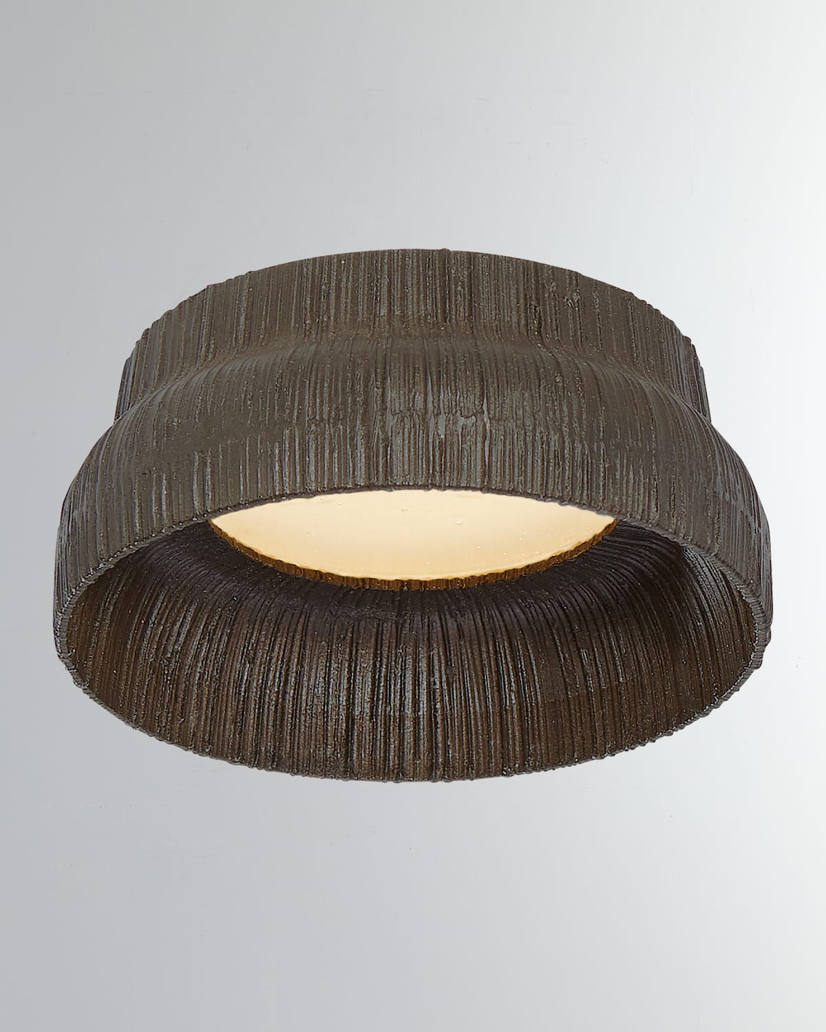 Flush mount with artisan crafted grooved metalwork frame. Fractured glass shade. Designed by Kelly Wearstler. UL listed damp. Uses one dedicated LED bulb. Overall: 2"T. Imported. Boxed weight, approximately 3 lbs.