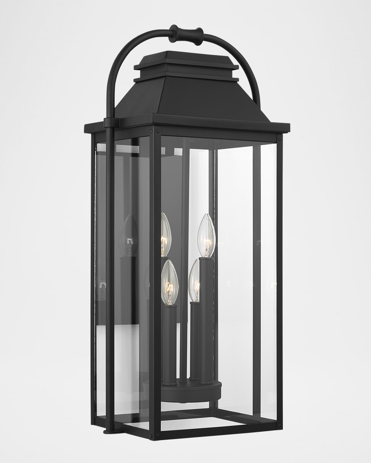 A subtle interplay of traditional design elements and nautical influences creates the Wellsworth outdoor collection's charming visual approach. Handcrafted of cast aluminum and glass Uses four 60watt candelabra base B10 bulbs Overall, approx. 12.5"W x 10.9"D x 26.9"T Backplate, 7.12"W x 1.0"D x 12"T Wire length, 8" Item weight, 15 lbs UL listed Wet rated Includes hanging hardware Assembly required Professional installation recommended Wipe clean Imported Boxed weight, approximately 23 lbs Proposition 65 warning for California residentsEntryway Lighting Sizing Guidelines:If a single Fixture is being installed, it should be about 1/3rd the height of the door. If 2 fixtures are being installed (one on each side), they can be slightly smaller, about 1/4th the height of the door. Fixtures should be installed at eye level; the center of the light source should be roughly 5.5amp;150;6 feet off of the ground. Garage Lighting Sizing Guidelines:Exterior fixtures illuminating the garage should be 1/4th to 1/3rd the height of the garage door.