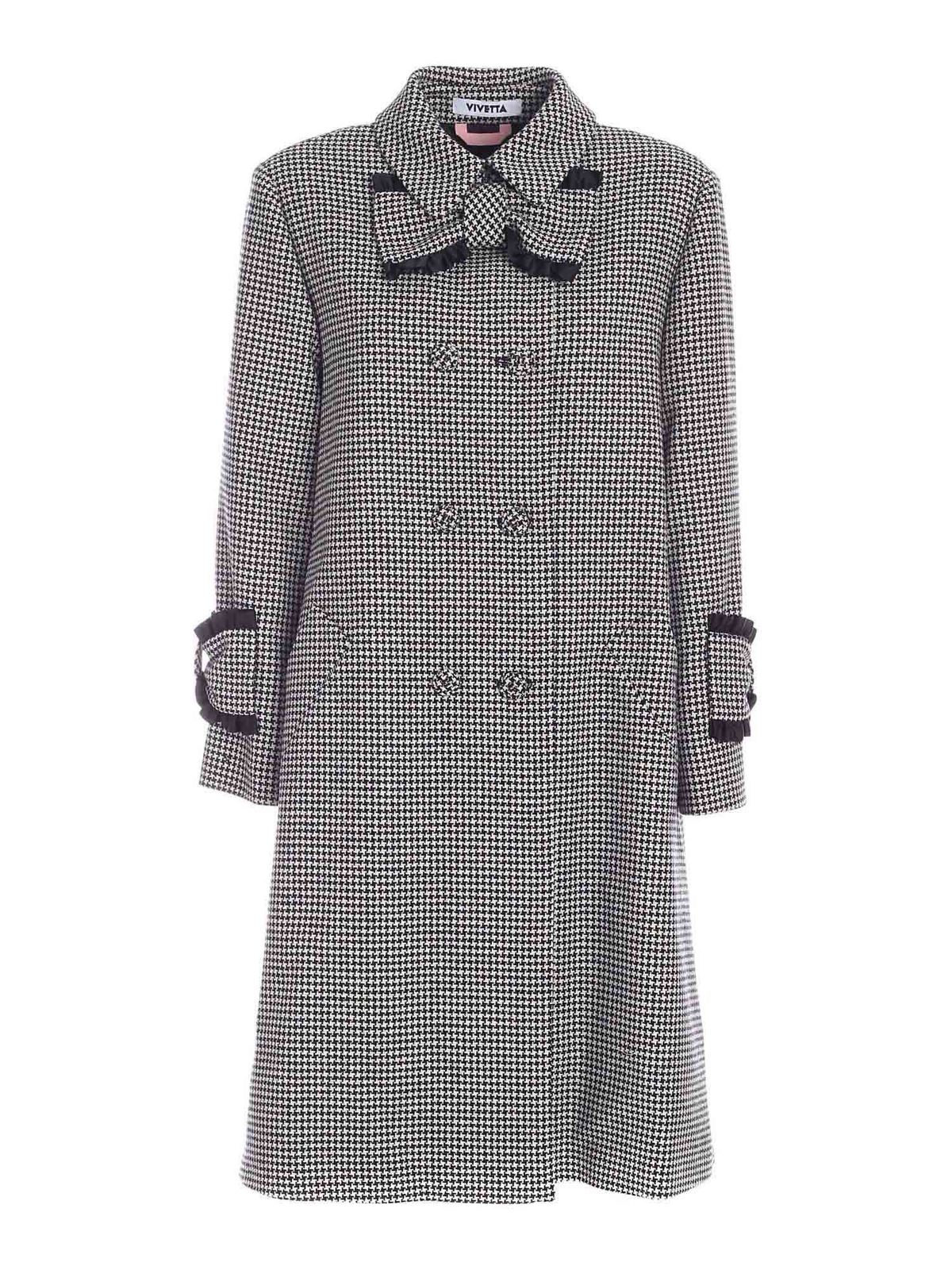 Manteau en laine et coton Couleur: blanc, noir Motif pied-de-poule Poches fendues latérales Détails de noeuds Fermeture à double boutonnage