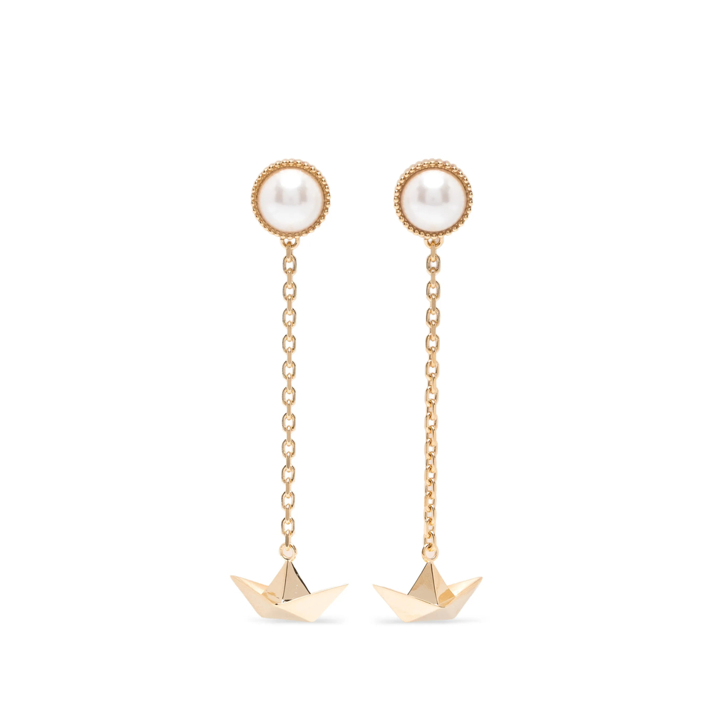 gold-tone pearl embellishment paper-boat pendant push-back fastening These earrings come as a pair. Normal everyday use and external agents may reduce the lustre of gemstones and gold surfaces. To maintain, use specific, non-abrasive products specially meant for cleaning jewellery. Your purchase will arrive with a gift box. This piece comes complete with a protective dust bag.