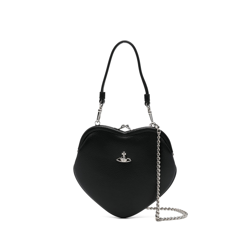 black grained finish orb logo kiss-lock closure top handle chain-link shoulder strap This piece comes complete with a protective dust bag.