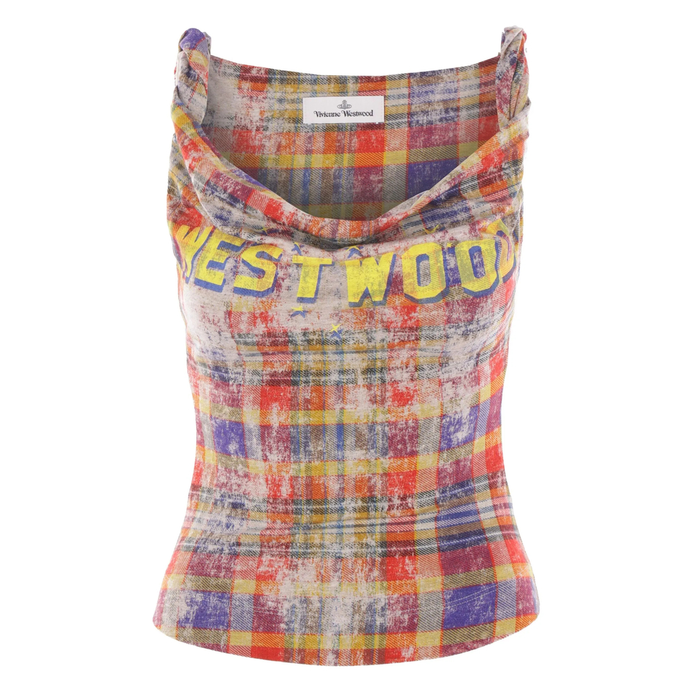 orange/multicolor plaid pattern cowl neck sleeveless logo print