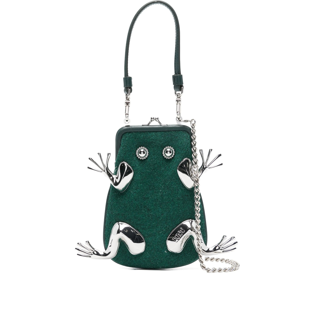 green frog detail detachable top handle chain-link shoulder strap Orb logo frame purse