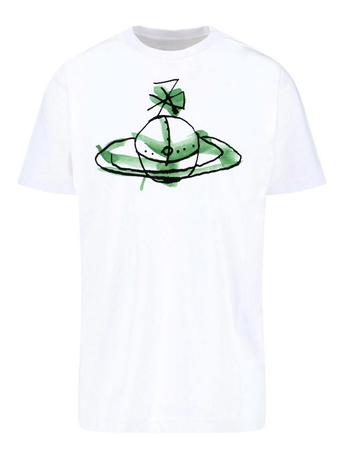 T-shirt classique Vivienne Westwood, blanc, manches transparentes, manches centrales, logo Corte Press, orbe dessiné, poitrine verte et noire, bord droit