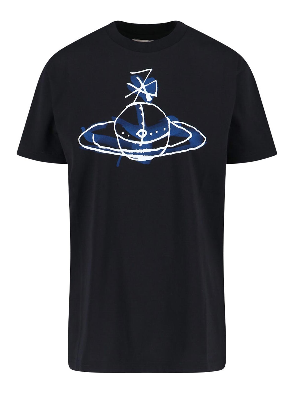 T-shirt classique Vivienne Westwood Black Strike Sleeves, logo Corte Press dessiné orbe A et animal de compagnie bleu Narlo Dritto