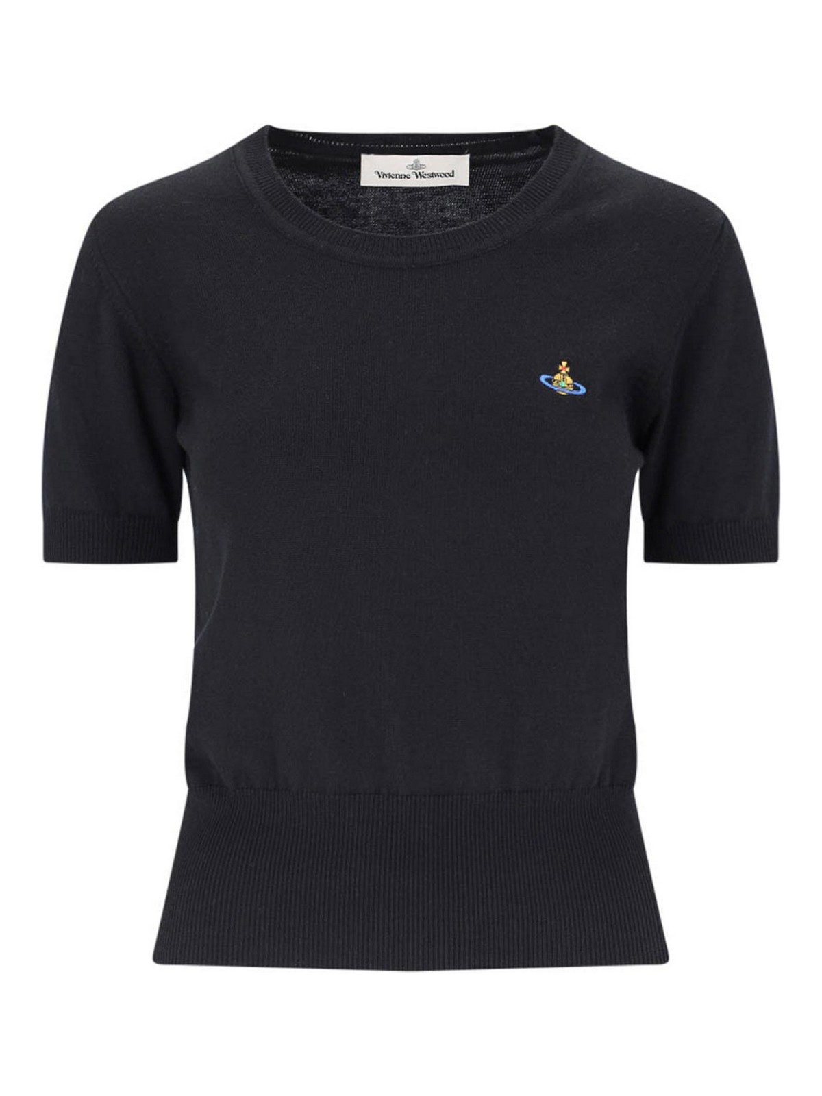 Bea Vivienne Westwood et noir, col rond, manches courtes, logo, boutons sur la poitrine, bordure côtelée, ourlet droit