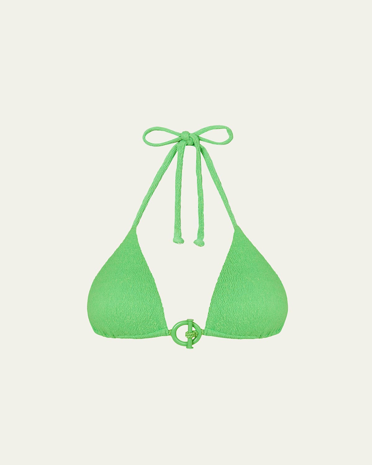 Vix "Audrey" bikini top in a textured finish with a tonal front toggle closure Halter neckline; selfties behind the neckline Triangle cups slide on string Removable soft cups Midback selfties Nylon/polyamide/elastane Lining: Elastane/nylon Hand wash Made in Brazil Bottoms sold separately