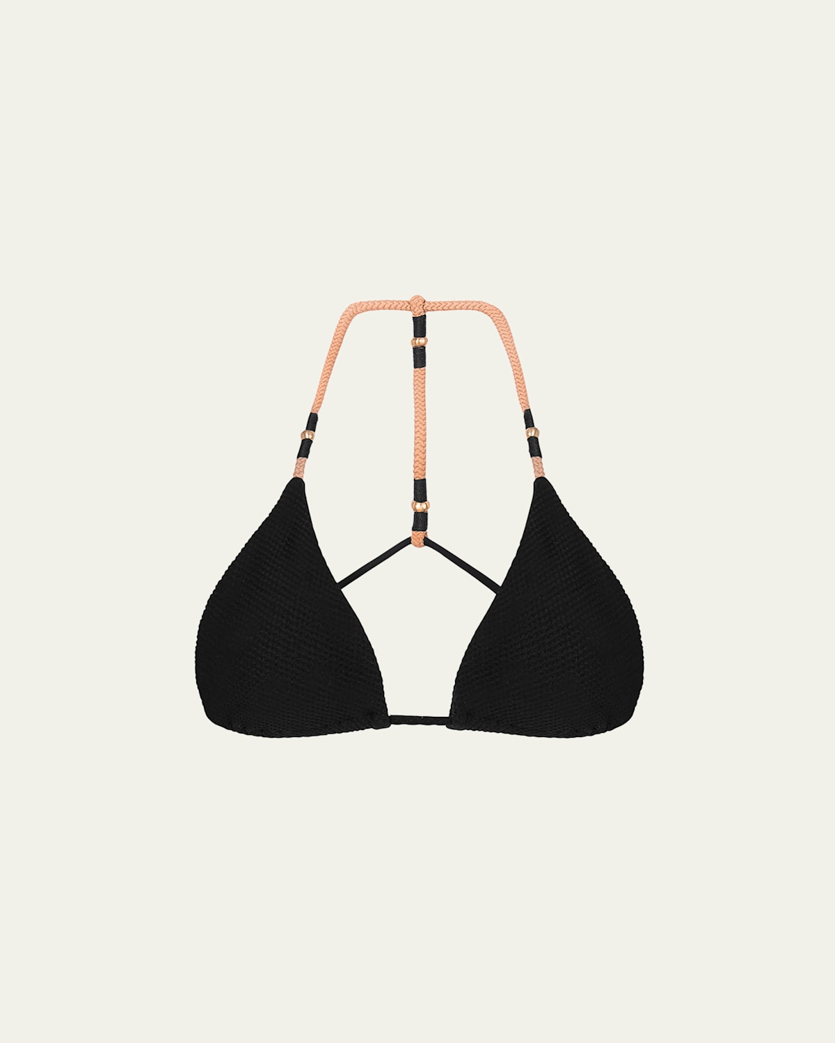 Vix "Maiori Layla" textured bikini top adorned with ropelike straps and 24k goldplated beads Halter neckline; selfties behind the neck Triangle cups slide on string Removable soft cups Midback selfties Nylon/polyamide/elastane Lining: Elastane/nylon Hand wash Made in Brazil Bottoms sold separately