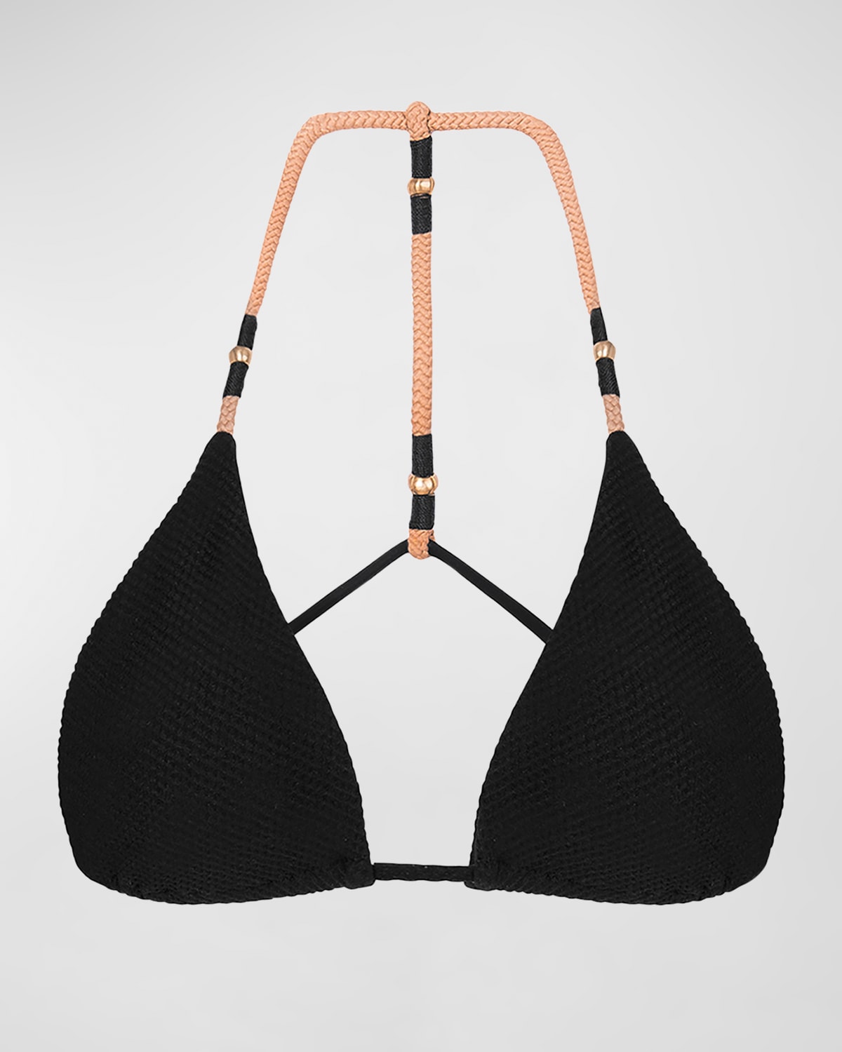 Vix "Maiori Layla" textured bikini top adorned with ropelike straps and 24k goldplated beads Halter neckline; selfties behind the neck Triangle cups slide on string Removable soft cups Midback selfties Nylon/polyamide/elastane Lining: Elastane/nylon Hand wash Made in Brazil Bottoms sold separately