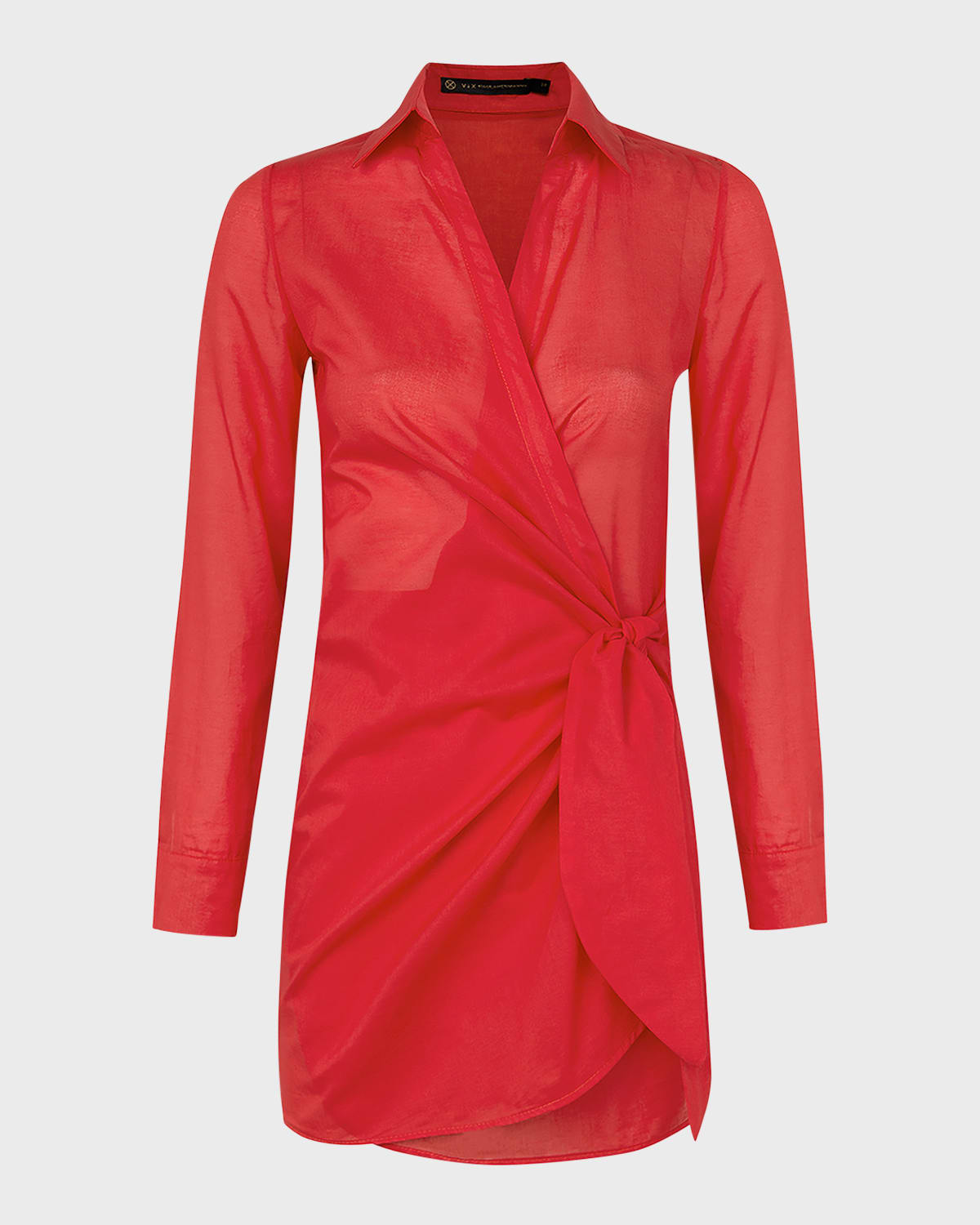 Vix "Lia" feminine, flirty, and flowy coverup in a semisheer fabrication Collared surplice neckline Selftie waist Long sleeves Hem falls above the knee Slipon closure Cotton Hand wash Made in Brazil