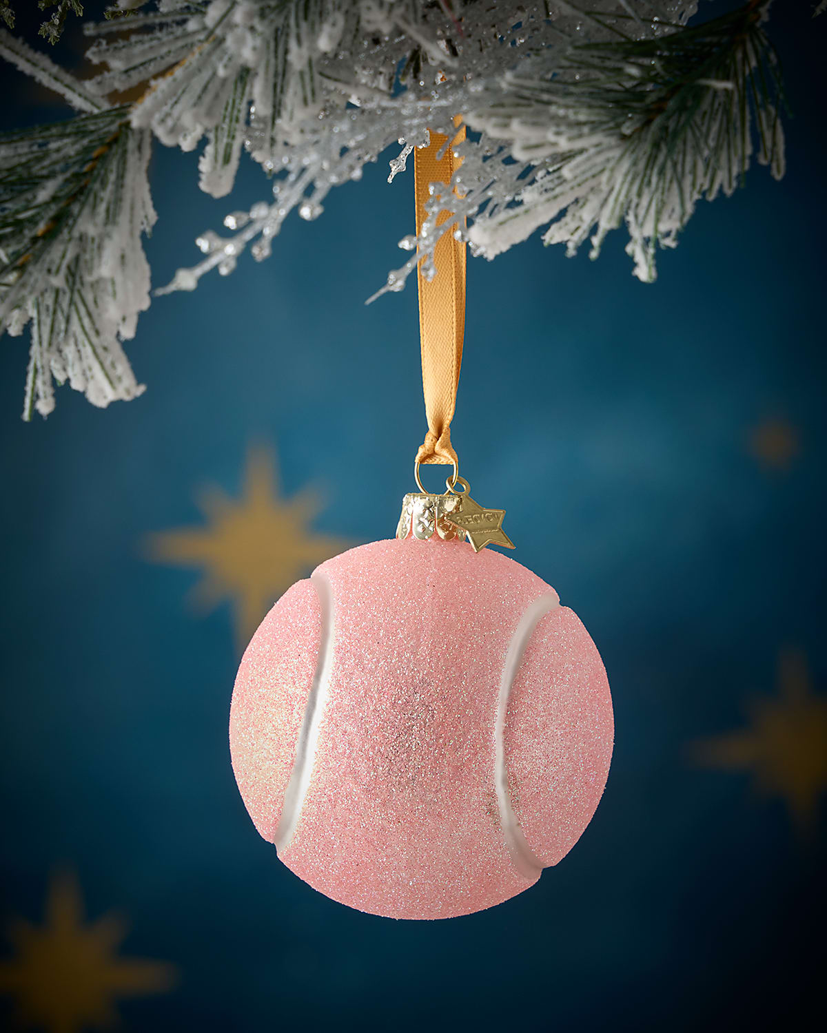 Show off your love for your favorite sport with this colorful tennis ball Christmas ornament, handpainted in Opal Pink and embellished with glitter. Handcrafted of mouthblown glass Approx. 3.9"Dia. Handle with care Wipe clean Imported