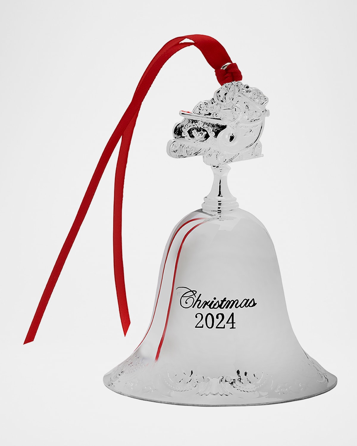 This beautiful 2024 Silver Plated Bell Ornament is the 30th Anniversary Edition in this annual series from Wallace. The words Christmas 2024 are prominently on the front. This limited edition collectible features a festive and cheery Santa riding in his sleigh as the finial. Includes a gift box and ribbon for hanging and comes with a clapper Handcrafted of silverplated metal Approx. 3"Dia. x 4.75"T Item Weight (Lbs.): 0.5 If necessary, polish with silver polish, use as directed Imported