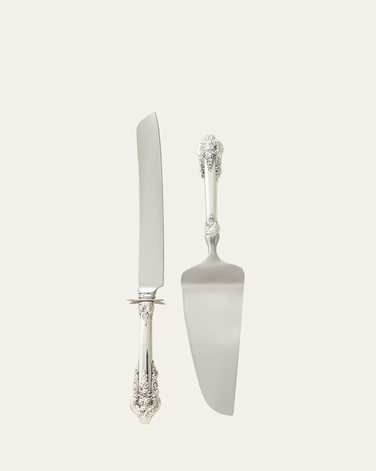 Sterling silver cake set. Design inspired by the lavishness and romance of the 16th century. Celebrating Grand Baroque's 75th anniversary. Set includes knife and server. Hand wash. Made in the USA.