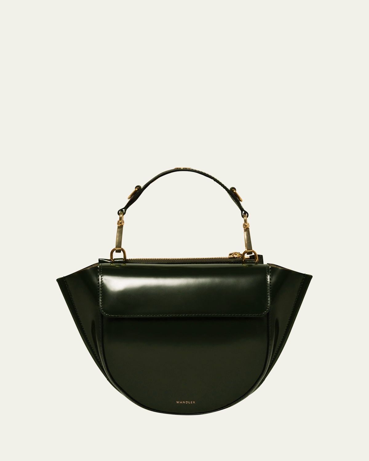 Wandler "Hortensia" shoulder bag crafted in smooth patent leather with goldtone eyelet embellishments Detachable top handle Detachable shoulder strap Can be worn as a tophandle or shoulder bag Flap top with magnetic closure Exterior, one slip pocket and one zip pocket Interior, one slip pocket Lining: Polyurethane Approx. 6.9"H x 10.6"W x 2"D Made in Italy