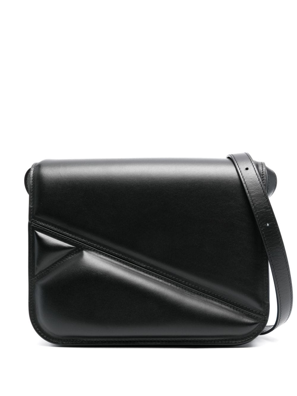 black calf leather smooth grain polished finish embossed finish decorative stitching contrasting trim gold-tone logo lettering adjustable shoulder strap foldover top with magnetic fastening slip pocket to the front main compartment internal slip pocket