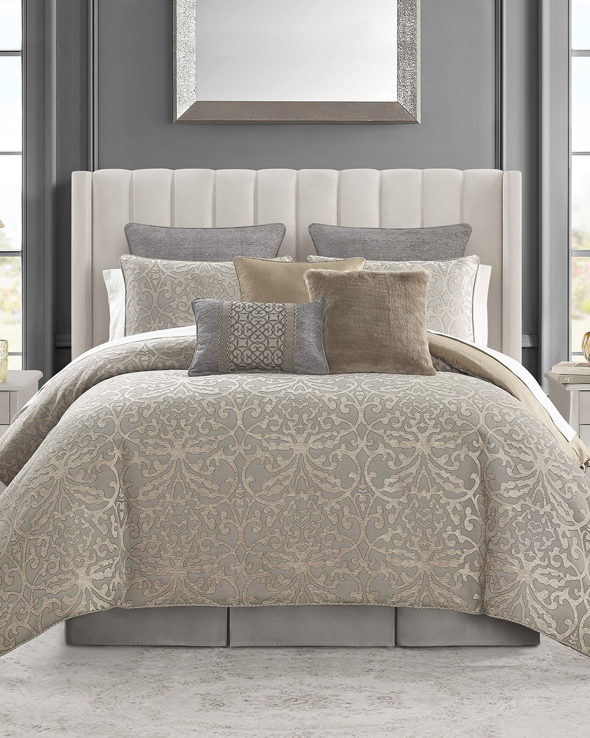 The Carrick 6Piece Comforter Set by Waterford Fine Linens showcases a sophisticated damask scroll jacquard in shades of beautiful champagne and grey that reverses to a smallscaled champagne medallion pattern. Includes one comforter, two king shams, two euro shams, and one boxpleated dust skirt Euro shams feature a textured chenille that reverses to small medallion pattern Shams have hidden zip closure Comforter, approx. 96" x 110" King shams, 20" x 36" Euro shams, 26"Sq. Dust skirt, 78" x 80"; 16" drop Item Weight (Lbs.): 4.0 Polyester Dry clean Imported