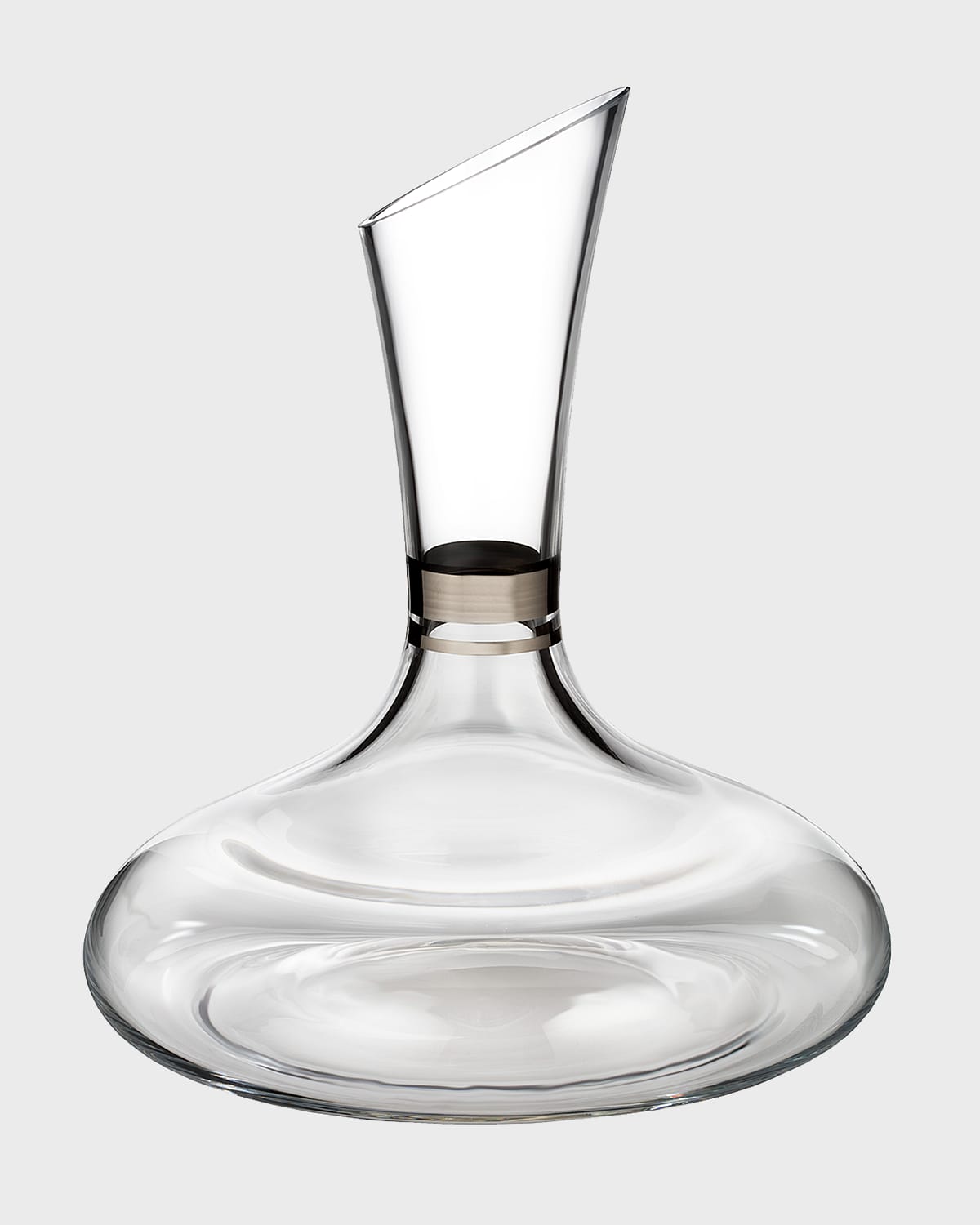 Handmade crystal decanter from the Elegance collection. Platinum bands layered at neck. Approx. 10.8"H x 9.4"Dia. Holds 84.5 oz. Made in Slovenia.