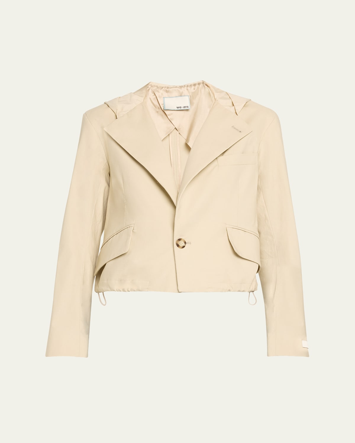 WEAR4 "The Cropped Hooded Blazer" in an upcycled cottonblend Hooded neckline Singlebreasted front Long sleeves with button cuffs Flap pockets Straight fit Cropped length Single button closure Cotton/nylon/polyamide Dry clean Made in Italy