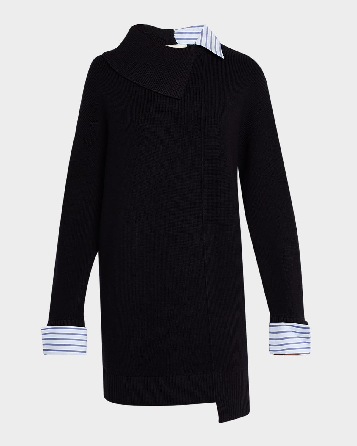 WEAR4 "The Midtown" upcycled combo mini dress finished with stripe shirting details Asymmetric collar Long sleeves with button cuffs Shirtdress silhouette Hem falls above the knee Slipover style Wool/cotton Dry clean Imported