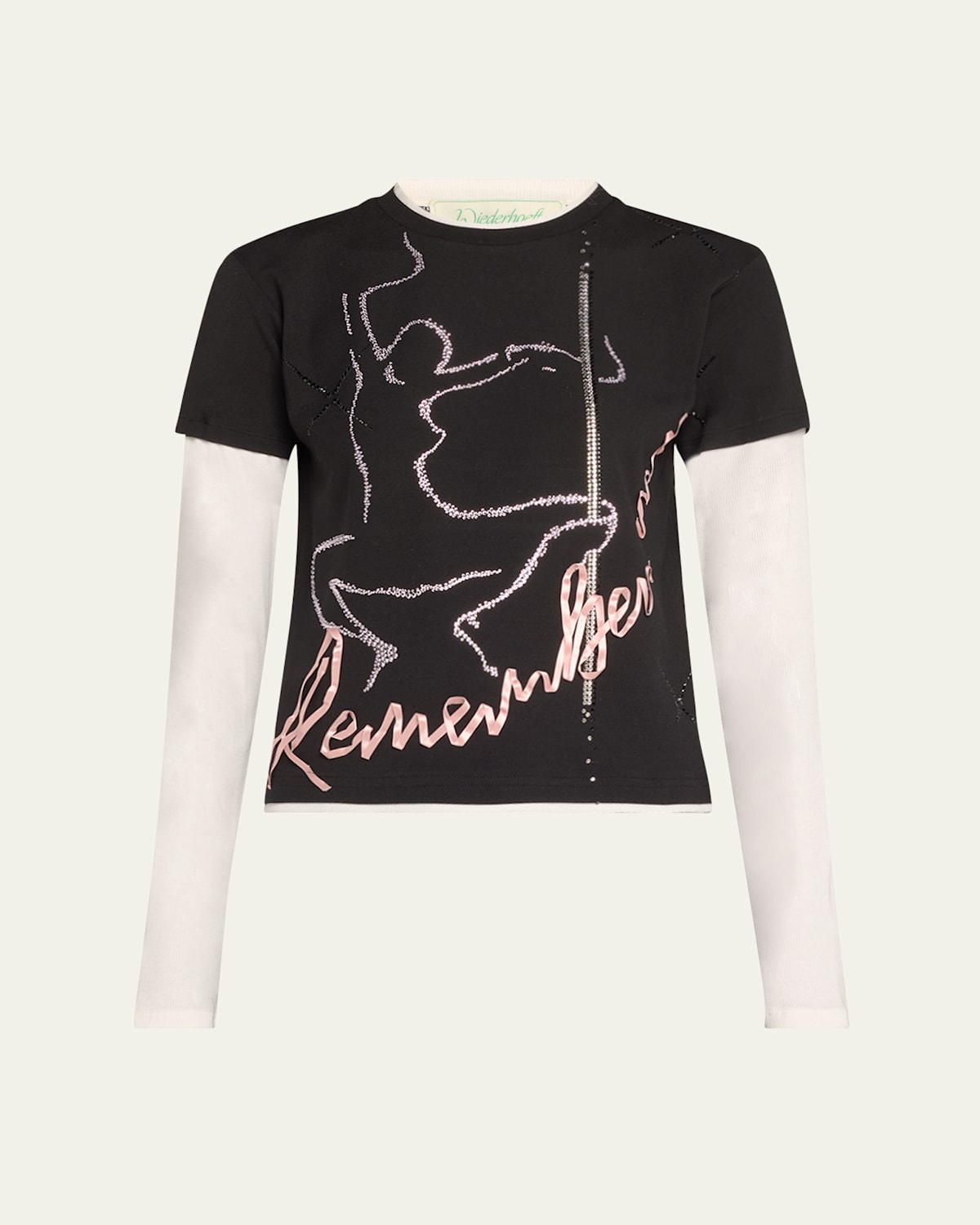 Wiederhoeft "Remember me" double layer Tshirt with hotfix crystal embellishment Crew neckline Long sleeves Relaxed fit Pullover style Cotton Dry clean Made in USA