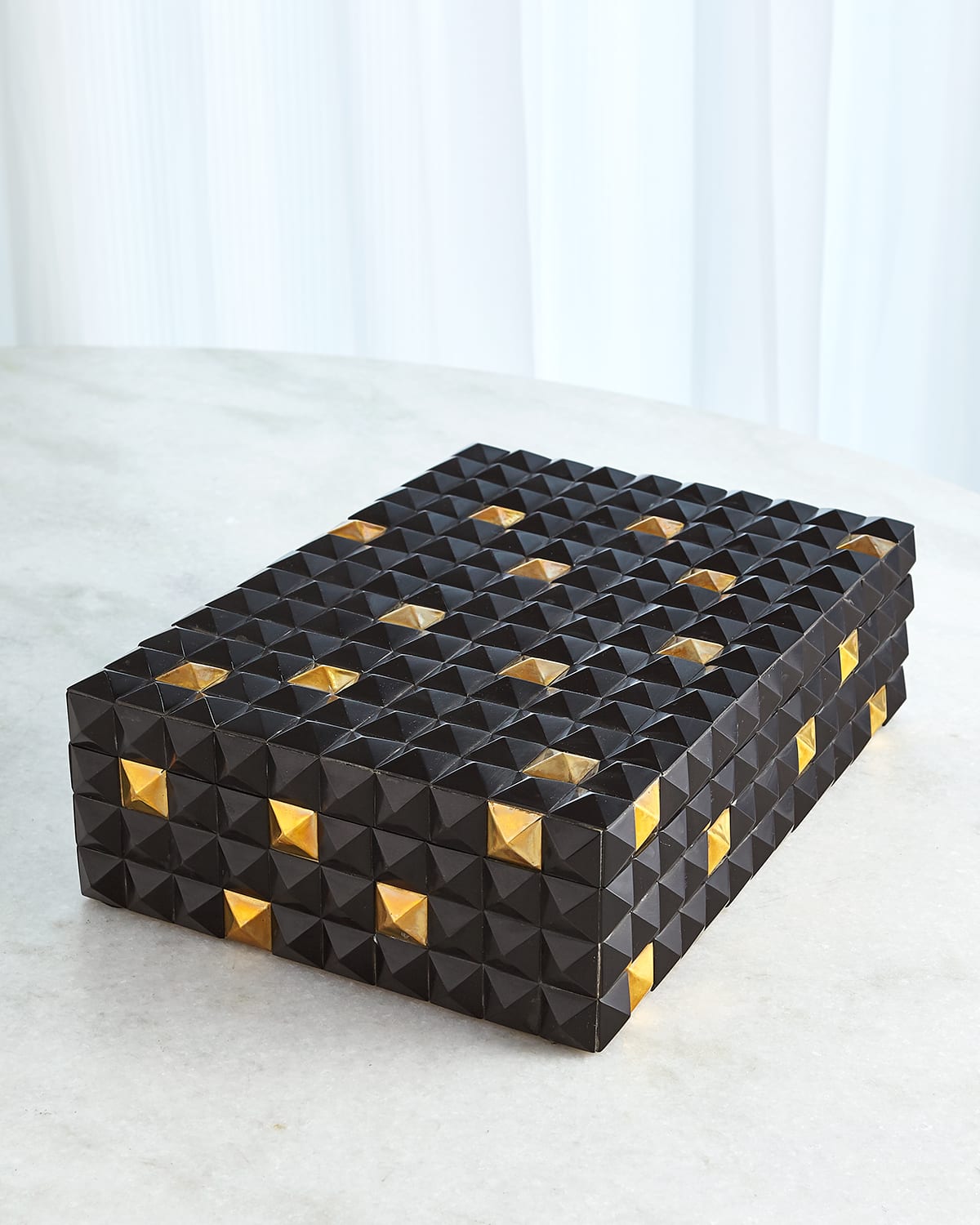 Elevate your work space with this chic Pyramid Box, entirely hand made from wood composite. The brass and resin accents are sure to take your work space to the next level and the wood composite substrate gives this item strength and stability to pass the test of time without warping or moving. 14"L x 10.5"W x 4"T. Dust with dry cloth. Weight: 4.6 lbs. Imported.