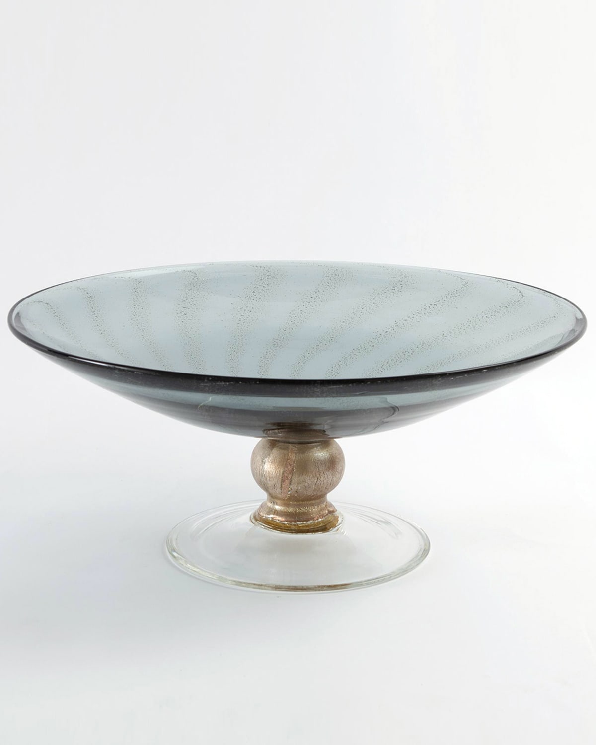 Our Spiral Palace Footed Bowl is made from hand blown Italian art glass and features 24karat gold leaf detailing at the base. Overall: 17"Dia. x 7.25"T. Hand wash. Made in Italy.