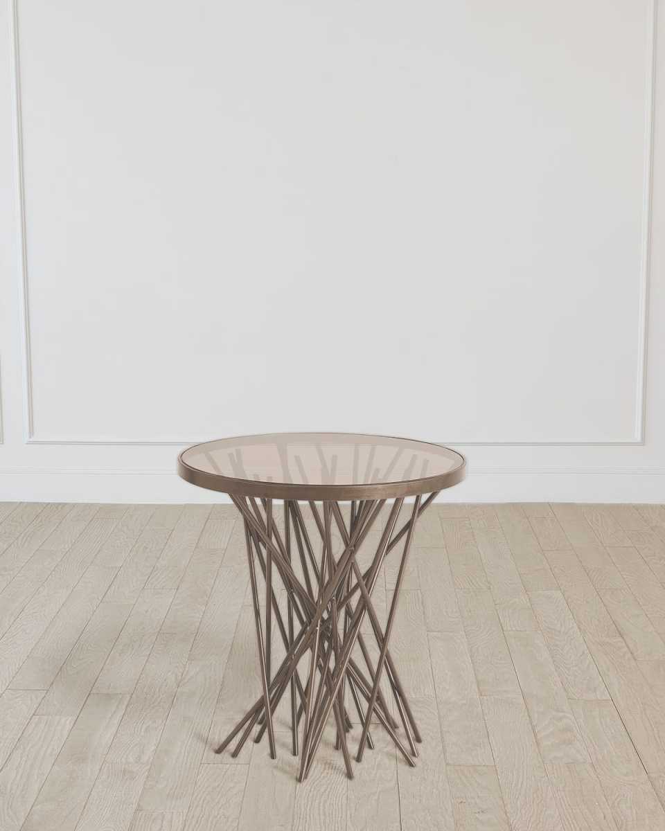 Resembling a bushel of sticks, our Stix Side Table features a smoke glass top and a light gunmetal finished iron base. Overall: 20"Dia. x 21.25"T. Dust with dry cloth, clean glass with glass cleaner. Imported. Boxed weight, approximately 49 lbs.