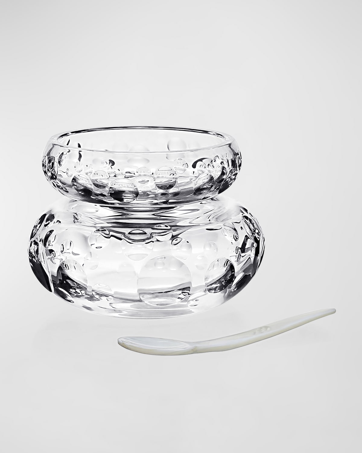 This caviar server for two is such an elegant but fun way to serve caviar. The round pearl shape cutting on the two bowls perfectly matches with pearls of caviar. Handcrafted of mouthblown glass Approx. 4.5"Dia. x 3.3"T Capacity, 6 oz. Hand wash Made in Slovenia