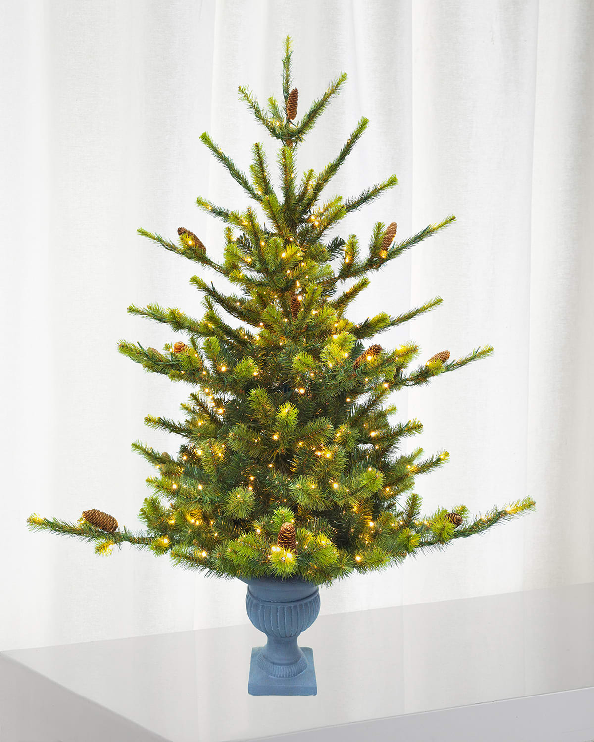 Ready your home this holiday season with this realistic potted Christmas tree, which will last for years to come. Handcrafted of vinyl and metal Real pine cones attached to some of the branches 450 branch tips; 450 warm white lights Plugin cord to turn on the lights Overall, approx. 48"Dia. x 60"T Hardware is not included Item Weight (Lbs.): 24.2 Wipe clean Imported Boxed weight, approximately 30.8 lbs