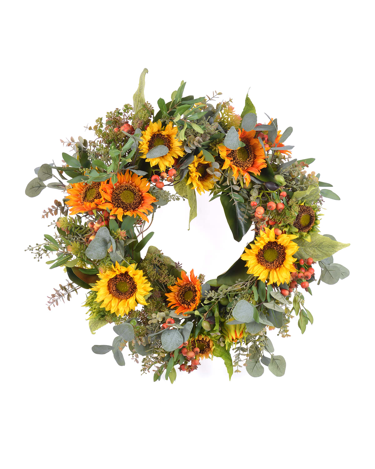 Sunflower and mixed greens wreath. Handmade of polyester. Made in the USA of imported materials.