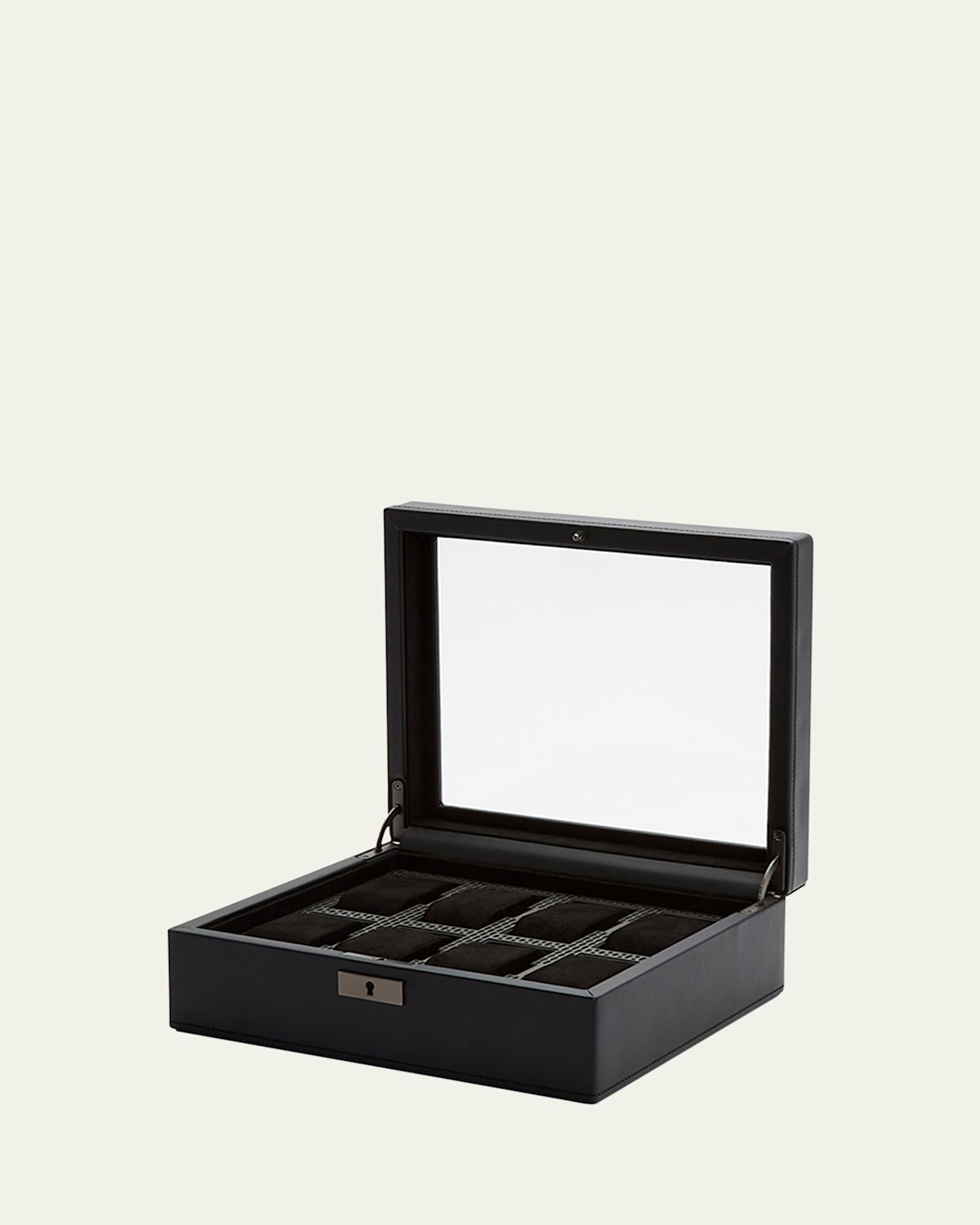 Powdercoated and copperplated lasercut perforated steel melded with clean, sleek lines. Axis drives a modern, bold look for the safe keeping of your timepieces. Made from vegan leather (polyurethane) and glass. Eightpiece watch storage Lock and key security Suspended watch cushions Softclose hinges Smartwatch USB port Approx. 10.5"L x 9"W x 3.75"H Imported