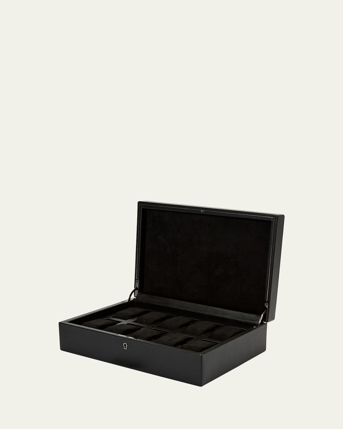 Quadangled paneled lid. Lock and key security. Suspended watch cushions. Smartwatch USB port. Materials: vegan leather. Approx. 13"L x 9"W x 4"H Imported