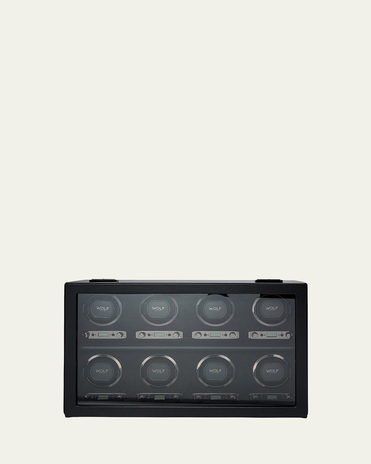 Eight watch winder Double lock and key closure Clear panel in door Lockin dynamic cuff to secure timepiece to rotator drum Watch returns to starting position when the cycle is complete Pebble grain vegan leather body Suede interior Metallic foiling details Approx. 20.5"W x 6.5"D x 13.3"T Item Weight (Lbs.): 15.5 Wipe with damp cloth Imported
