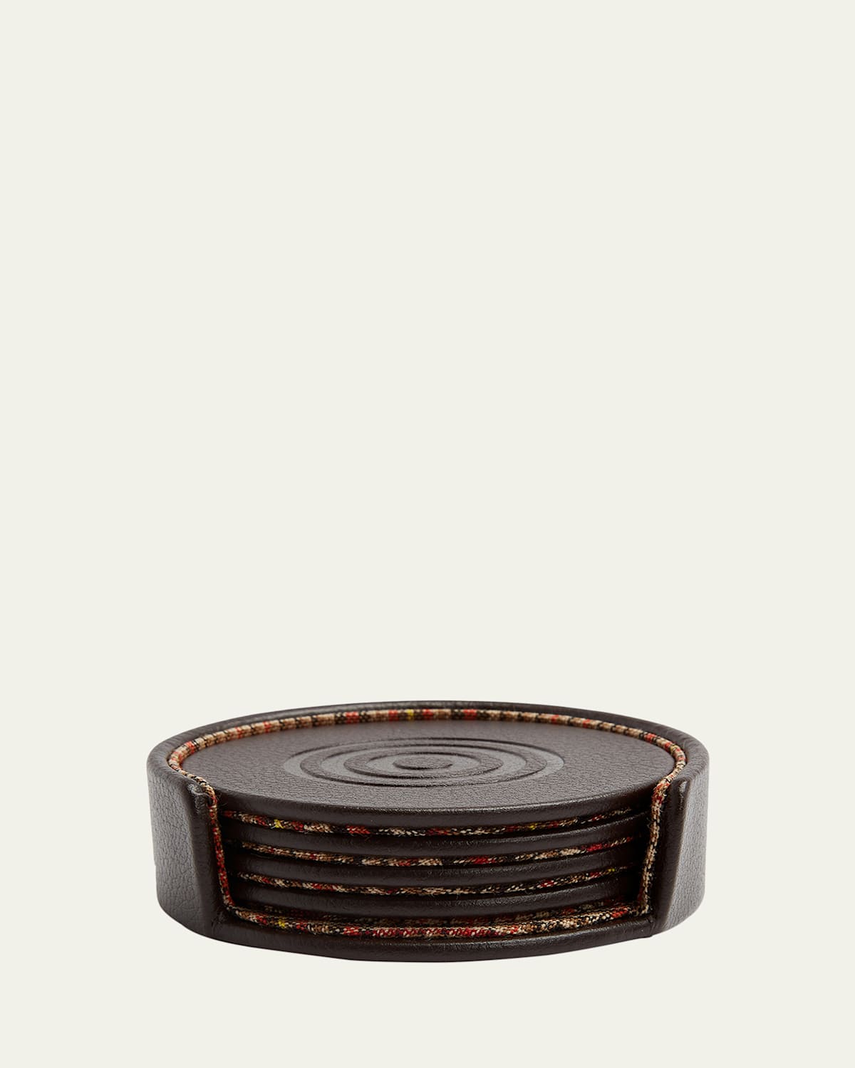 Coaster set is handcrafted of leather and Negroni tweed WOLF x WM Brown collaboration Includes four coasters and a sleek storage tray Approx. 3.9"Dia Item Weight (Lbs.): 0.2 Imported
