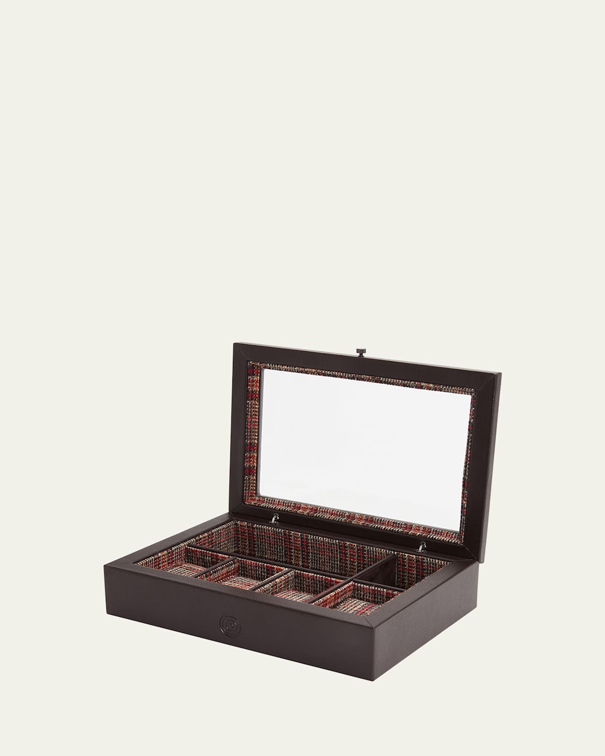 Storage for four watches on suspended cuffs and two compartments for watchstraps, watch tools, or your favorite pair of cufflinks Crafted of polyester, wood composite, and zinc alloy Approx. 12"L x 8.5"W x 3.3"T Item Weight (Lbs.): 4.8 Wipe clean Imported