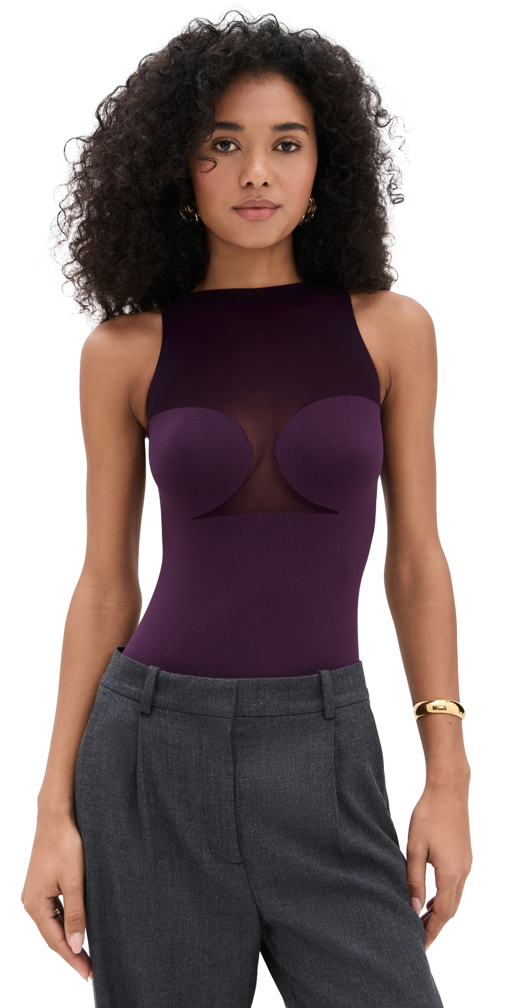 Fabric: Lightweight, super-stretch fine jersey. Semi-sheer paneling at front and back. Jersey lined gusset. Mock neck. Sleeveless. Thong back and snap gusset. Shell: 94% polyamide/6% elastane. Trim: 76% polyamide/24% elastane. Wash cold. Imported, Slovenia.