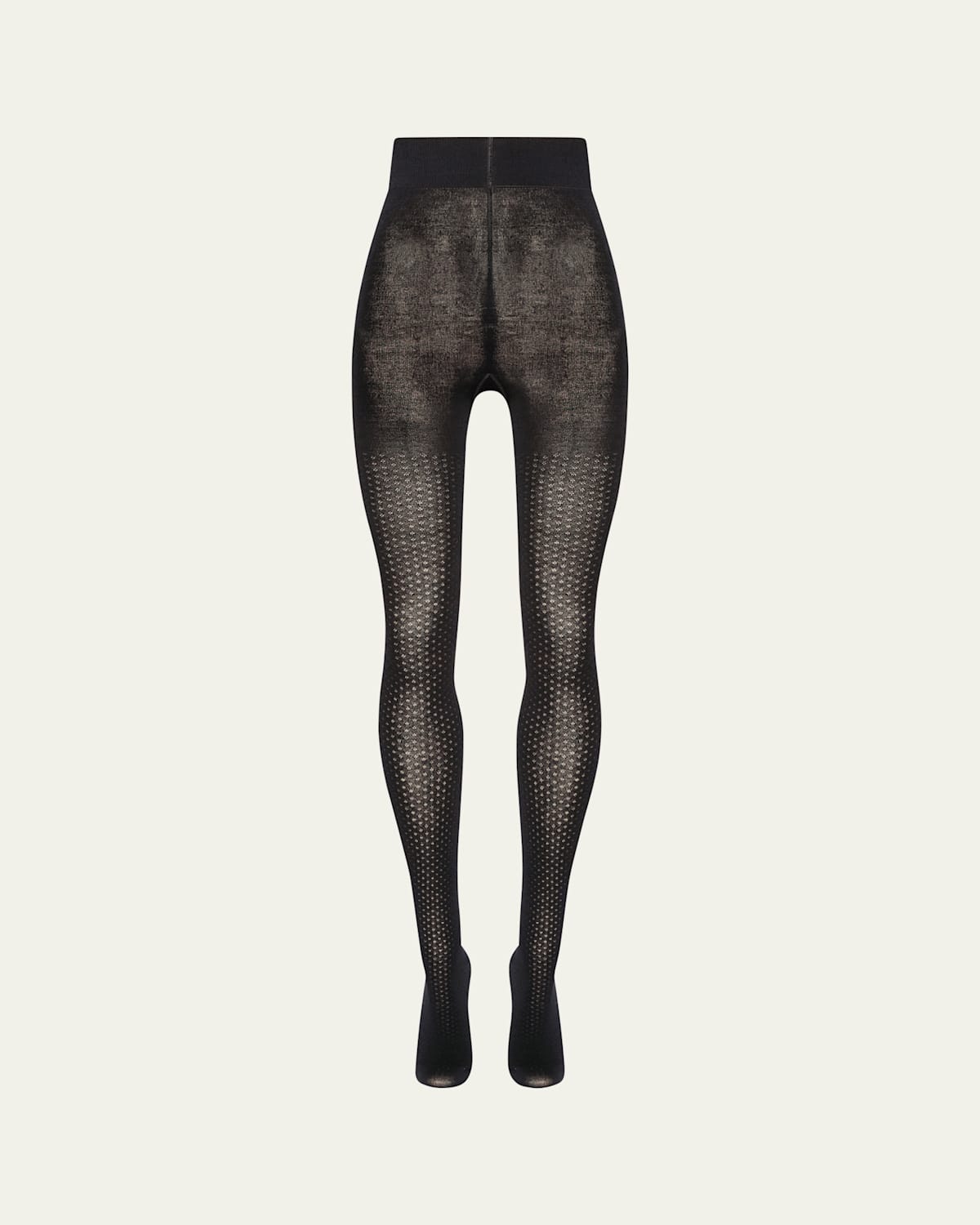 Wolford matte tights in sheer dotted Merino woolblend jacquard Dyeing meets the bluesign® standard for chemical, water, and energy usage Knittedin soft waistband and heels 100 denier Wool/elastane Made in Austria