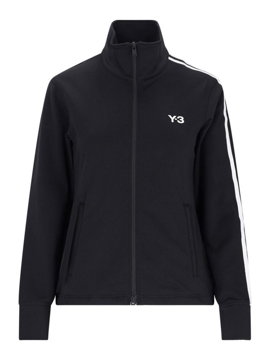 Veste zippée 3-store y-3 en noir avec col haut, double fermeture éclair sur la poitrine, logo, bandes emblématiques avec deux poches latérales élastiquées sur un ourlet droit
