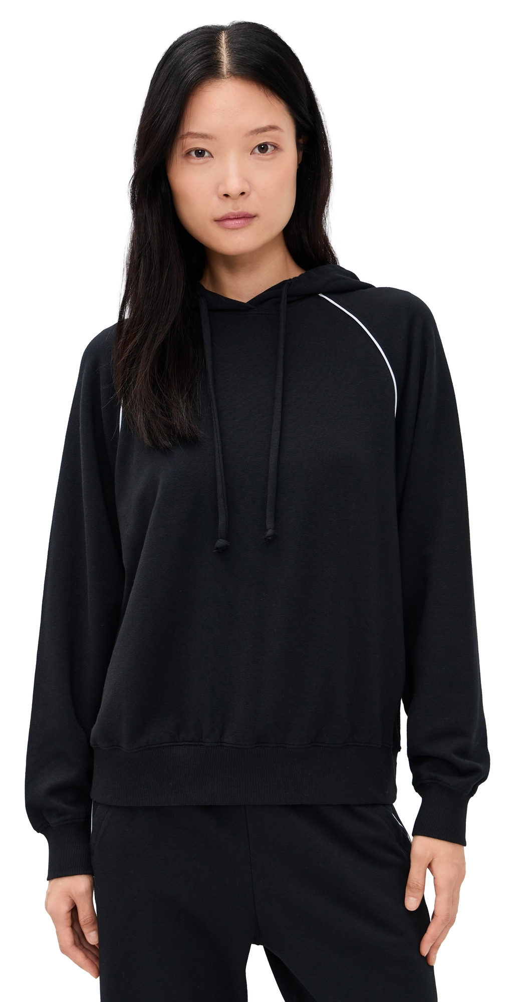 Fabric: Mid-weight stretch fleece. Contrast piping. Hooded neckline. Long sleeves. Shell: 68% modal/28% cotton/4% spandex. Wash cold. Made in the USA. Measurements: Measurements from size S Length: 22.75in / 58.0cm, from shoulder