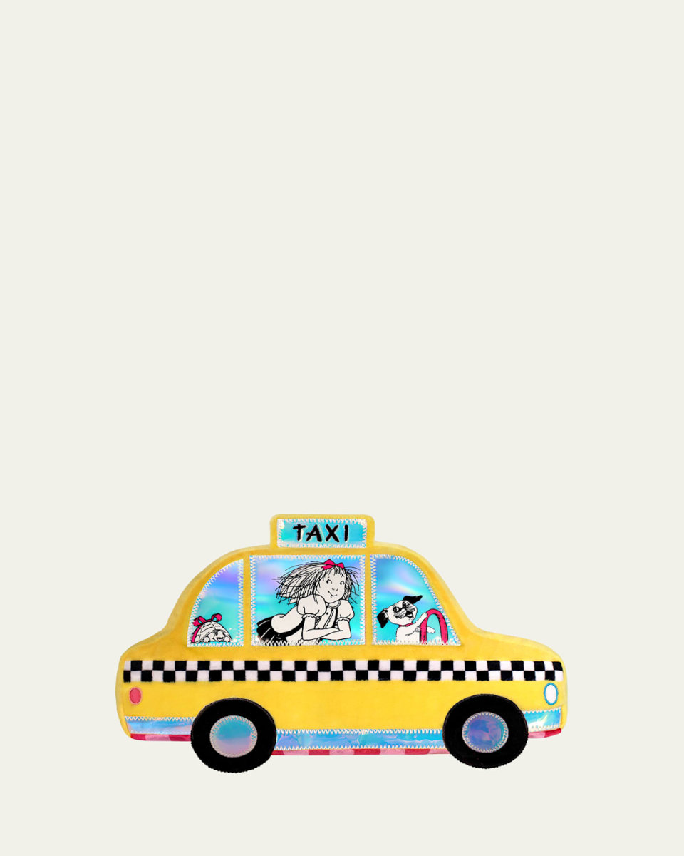 Jellycat "Eloise Taxi" plush pillow Iridescent silver windows, classic taxi signage, and accent details on the front balance Eloise's signature pink stripe pattern on the back of this soft plush yellow taxi. Eloise boldly dresses up this traditional taxi to serve as a playtime companion and a chic decorative pillow. Eloise's pet pooch, weenie, is behind the wheel to steer into imaginative Eloise adventures with Eloise and pet turtle, Skipperdee, along for the ride! Approx. 8"L x 15.0"W Recommended for ages: 0 and up Item Weight (Lbs.): 0.4 Polyester/vinyl Imported
