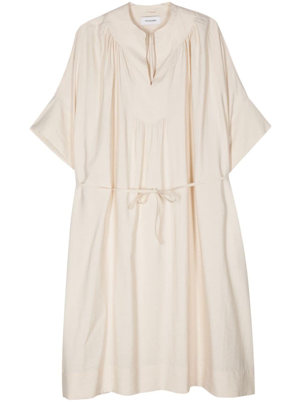 light beige silk blend shift style V-neck ruched detailing short sleeves belted waist straight hem unlined