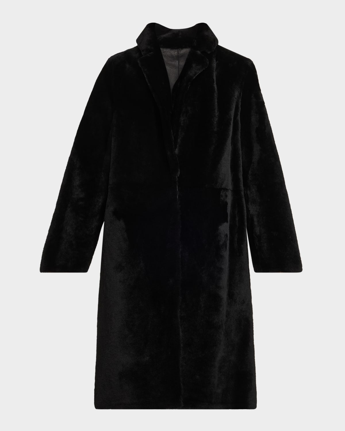 Yves Salomon long coat in dyed lamb shearling (Spain). Notched collar. Long sleeves. Snap placket front. Aline silhouette. Hem hits at knee. Made in France.