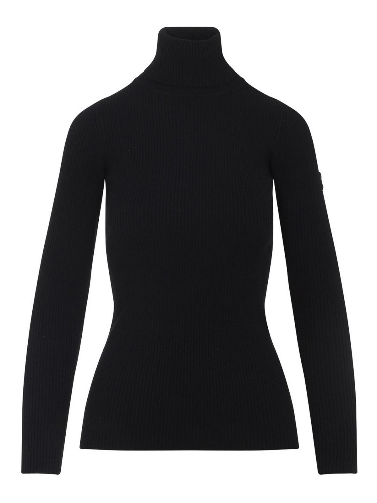 Pull noir Yves Salomon confectionné à partir de côtes et col roulé noirs, manches longues, logo, coupe ajustée