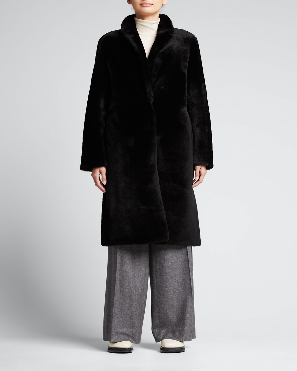Yves Salomon reversible coat with dyed lamb shearling (France) and lambskin leather Collared neckline Long sleeves Covered snap placket Belowknee length Professional cleaning recommended Made in France