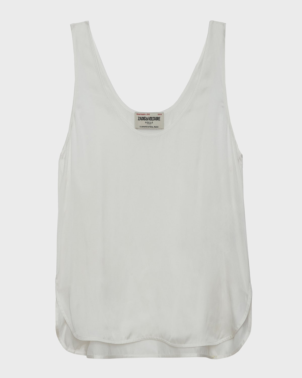 Zadig amp; Voltaire "Carys" flowing satin tank top Scoop neckline Sleeveless Cutaway armholes Hip length Relaxed fit Pullover style Polyester/polyester Hand wash or dry clean Imported